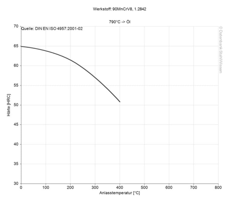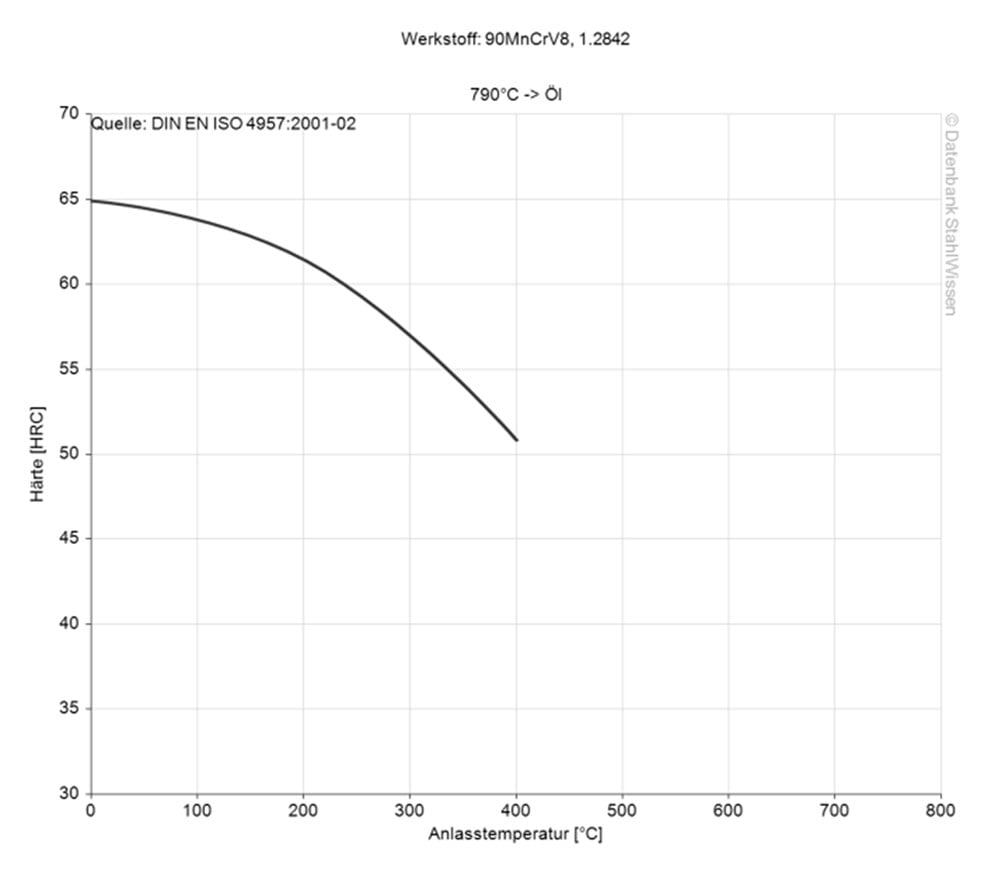 ako stal narzędziowa, stal 1.2842 / 1.2510 (90MnCrV8 / 100MnCrW4) spełnia szeroki zakres właściwości, w tym dobrą skrawalność, dobrą stabilność wymiarową w stanie zahartowanym, dobre zachowanie krawędzi i dobre połączenie wysokiej twardości powierzchni i ciągliwości po hartowaniu i odpuszczaniu.